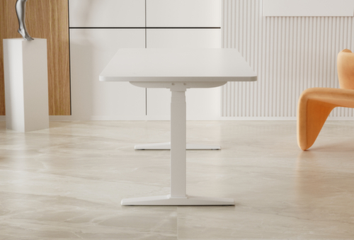 Die wichtigsten Maße des UDOBÄR Schreibtisches auf einen Blick:Platte aus Spanplatte mit pflegeleichter Melaminharzbeschichtung in Dekor weiß. Plattenform rechteckig. Kante mit stoßfestem ABS-Umleimer. T-Fußgestell aus Metall mit schlag- und kratzfester Pulverbeschichtung in weiß. Rohrform Rechteckrohr. Höhenverstellung durch 2 Elektromotoren. Die Steuerung erfolgt bequem und visualisiert durch Handschalter und Display. Dies sorgt für einen einfachen und schonenden Verstellvorgang. Funktionen: Abspeichern und automatisches Abrufen von programmierten Tischhöhen dank Memoryfunktion. Der automatische Kollisionsschutz stoppt sofort bei Widerstand von oben oder unten und sorgt somit für absolute Sicherheit. Gestell mit Bodenschoner. Schreibtisch mit kabelloser Ladestation, die in die Tischplatte integriert ist. So können Sie beim Arbeiten stets Ihre mobilen Endgeräte wie Smartphones laden, ganz ohne Kabelsalat auf der Arbeitsfläche. Mit Eurostecker.