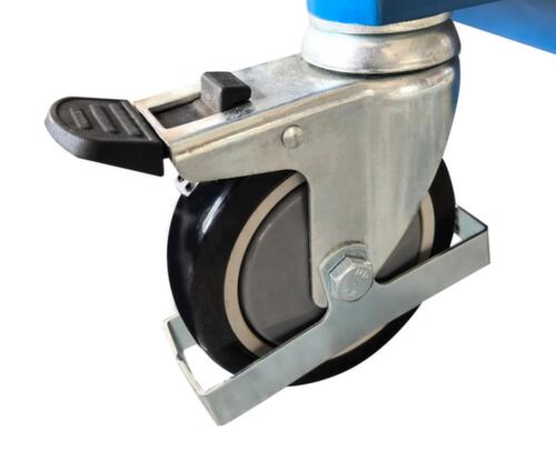 Aus Stahl mit schlag- und kratzfester Pulverbeschichtung in RAL5017 Verkehrsblau. Wenderadius 875 mm. Feststeller an zwei Lenkrollen gewähren bei Bedarf stets einen sicheren Stand. Plattform aus Polypropylen in schwarz. Hubbedienung elektrisch. Spannungsversorgung über Blei-Säure-Batterie 24V/20 Ah.