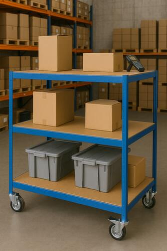 Ebenen im Raster von 40 mm verstellbar. Etage(n) aus Spanplatte. Etage(n) mit umlaufenden Auflagetraversen und Bodenunterzügen, gerade. Gestell mit strapazierfähiger Kunststoffbeschichtung in blau. Stahlkonstruktion. Leicht zu manövrieren und verfahren durch 4 Lenkrollen, Feststeller an zwei Lenkrollen gewähren bei Bedarf stets einen sicheren Stand. Rad Ø 100 mm. Räder mit Gummi-Bereifung. Naben mit Kugellager. Gehäuse aus Stahl.