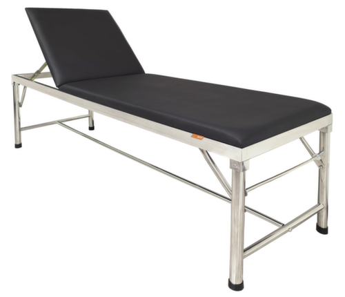 Geeignet für den nichtmedizinischen Bereich. Ideal etwa für Betriebe, Büros oder ähnliche Einrichtungen, wo die im Alltag stets stabile Konstruktion überzeugt. Liegefläche aus High Density-Schaumstoff. Bezug aus Kunstleder in schwarz. Gestell aus Edelstahl.