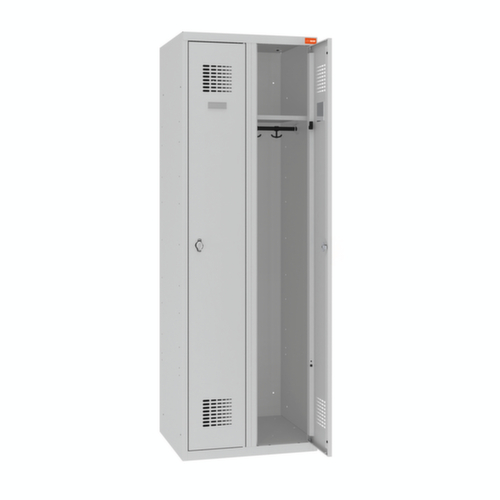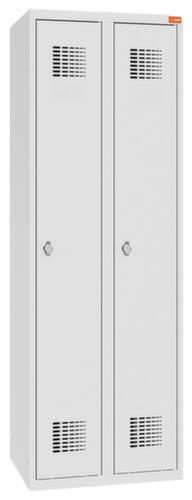Je Abteil 1 Hutboden, 1 Kleiderstange mit 2 Haken, Spiegel in der Tür. Flügeltür mit Etikettenrahmen. Die aufschlagenden Türen bieten den Vorteil, dass es im Schrank keinerlei Platzverlust gibt, da sie innerhalb des Schrankes keinen Platz einnehmen. Verschließbar mit Drehriegelverschluss. Die standardisierte WEMO-Perforation sorgt für optimale Luftzirkulation im Schrank. Der untergebaute Sockel sorgt dafür, dass das Gewicht des Schrankes gleichmäßig auf dem Boden verteilt wird. Dies erhöht die Stabilität und der Schrank kann schwerer Lasten aufnehmen, als ein Schrank mit Füßen. Außerdem können Schmutz, Staub und Feuchtigkeit nicht unter den Schrank gelangen, was die Reinigungsfläche verkleinert. Konstruktion aus Stahlblech. Korpus mit korrosionsfester Zirkoniumbeschichtung in RAL7035 Lichtgrau, Front mit korrosionsfester Zirkoniumbeschichtung in RAL7035 Lichtgrau.