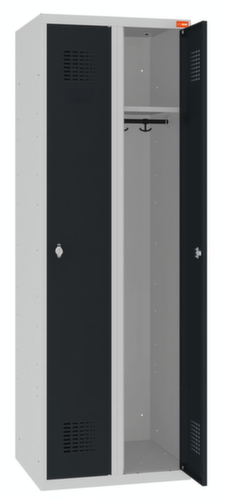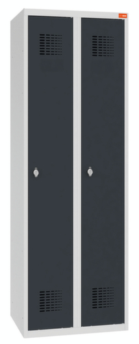 Je Abteil 1 Hutboden, 1 Kleiderstange mit 2 Haken, Spiegel in der Tür. Flügeltür mit Etikettenrahmen. Die aufschlagenden Türen bieten den Vorteil, dass es im Schrank keinerlei Platzverlust gibt, da sie innerhalb des Schrankes keinen Platz einnehmen. Verschließbar mit Drehriegelverschluss. Die standardisierte WEMO-Perforation sorgt für optimale Luftzirkulation im Schrank. Der untergebaute Sockel sorgt dafür, dass das Gewicht des Schrankes gleichmäßig auf dem Boden verteilt wird. Dies erhöht die Stabilität und der Schrank kann schwerer Lasten aufnehmen, als ein Schrank mit Füßen. Außerdem können Schmutz, Staub und Feuchtigkeit nicht unter den Schrank gelangen, was die Reinigungsfläche verkleinert. Konstruktion aus Stahlblech. Korpus mit korrosionsfester Zirkoniumbeschichtung in RAL7035 Lichtgrau, Front mit korrosionsfester Zirkoniumbeschichtung in RAL7016 Anthrazitgrau.