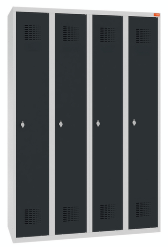 Je Abteil 1 Hutboden, 1 Kleiderstange mit 2 Haken, Spiegel in der Tür. Flügeltür mit Etikettenrahmen. Die aufschlagenden Türen bieten den Vorteil, dass es im Schrank keinerlei Platzverlust gibt, da sie innerhalb des Schrankes keinen Platz einnehmen. Verschließbar mit Drehriegelverschluss. Die standardisierte WEMO-Perforation sorgt für optimale Luftzirkulation im Schrank. Der untergebaute Sockel sorgt dafür, dass das Gewicht des Schrankes gleichmäßig auf dem Boden verteilt wird. Dies erhöht die Stabilität und der Schrank kann schwerer Lasten aufnehmen, als ein Schrank mit Füßen. Außerdem können Schmutz, Staub und Feuchtigkeit nicht unter den Schrank gelangen, was die Reinigungsfläche verkleinert. Konstruktion aus Stahlblech. Korpus mit korrosionsfester Zirkoniumbeschichtung in RAL7035 Lichtgrau, Front mit korrosionsfester Zirkoniumbeschichtung in RAL7016 Anthrazitgrau.