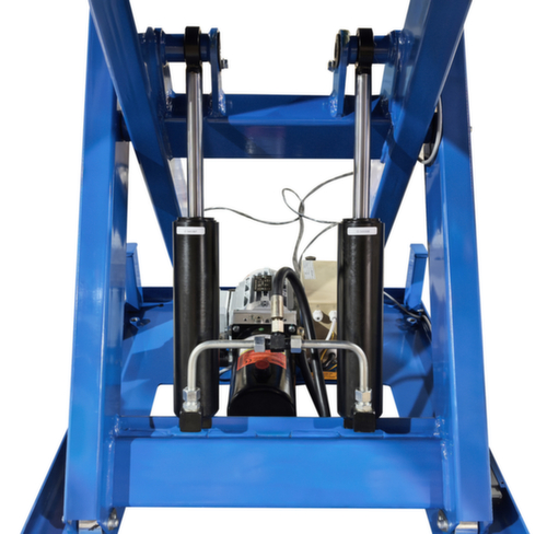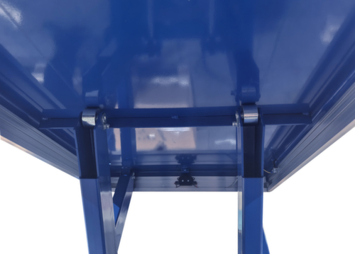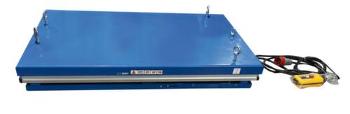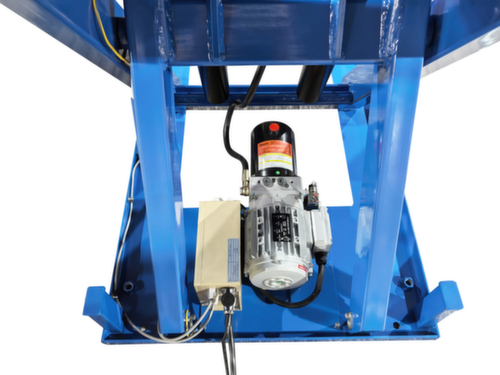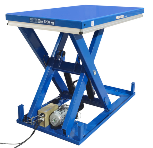 Aus Stahl mit schlag- und kratzfester Pulverbeschichtung in RAL5017 Verkehrsblau. Hubausführung elektrisch mit Handtaster für heben und senken. Einfachschere aus Stahl mit schlag- und kratzfester Pulverbeschichtung in RAL5017 Verkehrsblau. Verwindungssteife Stahlkonstruktion. Plattform mit Befestigungsbohrungen in der Grundfläche. In diese können bei Bedarf die mitgelieferten Hebeösen eingeschraubt werden, um den Hubtisch sicher mit Hebegurten transportieren zu können. Kabel 3,5 m lang. Mit 400 V/50 Hz. Schutzart IP54: Staubablagerung im Inneren, Spritzwasser alle Richtungen. Isolationsklasse F.