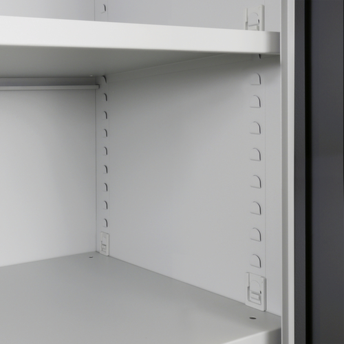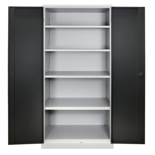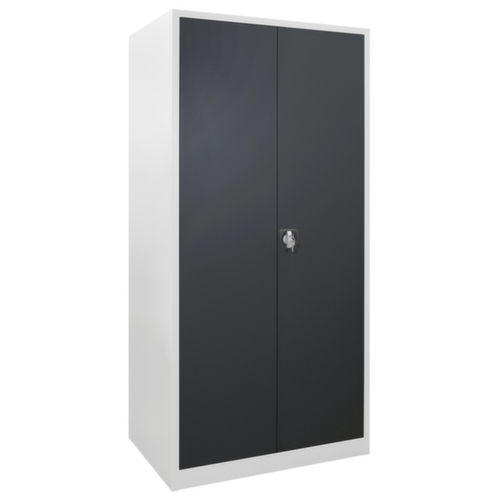 Die wichtigsten Maße des Universalschrankes auf einen Blick:Aus Stahl gefertigt. Hohe Flexibilität der Inneneinrichtung durch Verstellbarkeit der Fachhöhen im Raster von 25 mm. Ausgestattet mit Böden. Über die Doppelflügeltür ist der Zugriff auf den Schrankinhalt besonders komfortabel. Die einschlagenden Türen schließen bündig mit dem Korpus ab und bieten so keine hervorstehenden Kanten an denen man sich stoßen kann oder sich Staub ablagert. Jede Tür ist serienmäßig mit geräuschdämpfenden Gummipuffern ausgestattet, sodass auch beim schwungvollen Schließen die Tür nicht zuknallt. Dies sorgt für eine angenehme Geräuschkulisse und schont gleichzeitig den Schrank vor Beschädigungen. Verschließbar mit Schubstangenverschluss mit Zylinderschloss. Die 2-Punkt-Sicherheitsverriegelung bietet hohe Stabilität und einen effektiven Einbruchschutz.
