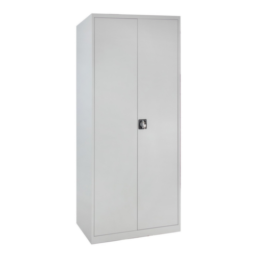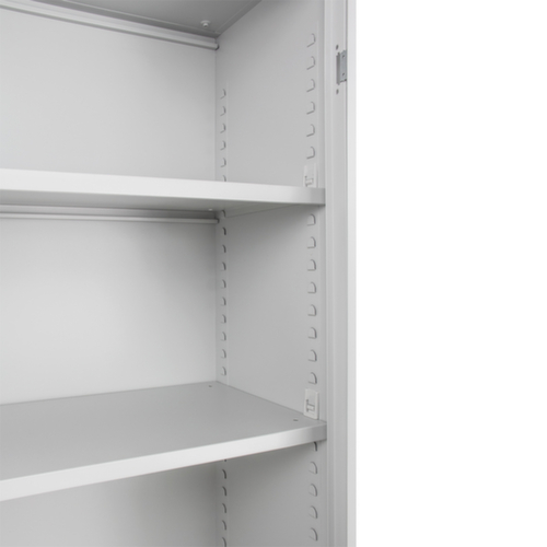 Die wichtigsten Maße des Universalschrankes auf einen Blick:Aus Stahl gefertigt. Hohe Flexibilität der Inneneinrichtung durch Verstellbarkeit der Fachhöhen im Raster von 25 mm. Ausgestattet mit Böden. Über die Doppelflügeltür ist der Zugriff auf den Schrankinhalt besonders komfortabel. Die einschlagenden Türen schließen bündig mit dem Korpus ab und bieten so keine hervorstehenden Kanten an denen man sich stoßen kann oder sich Staub ablagert. Jede Tür ist serienmäßig mit geräuschdämpfenden Gummipuffern ausgestattet, sodass auch beim schwungvollen Schließen die Tür nicht zuknallt. Dies sorgt für eine angenehme Geräuschkulisse und schont gleichzeitig den Schrank vor Beschädigungen. Verschließbar mit Schubstangenverschluss mit Zylinderschloss. Die 2-Punkt-Sicherheitsverriegelung bietet hohe Stabilität und einen effektiven Einbruchschutz.