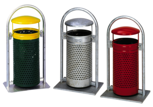 "metaDescription": "VAR Abfallbehälter RB 001 mit Rohrbogenständer und Schutzdach - 65 l, Stahlblech, in verschiedenen Farben",