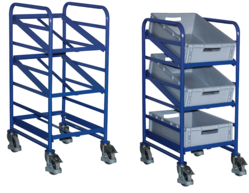 "description": "Tragl. 200kg, 3 Etage(n), Ladefl. LxB 410x610mm, Stahlplatte, m. Winkelrahmen, geneigt, m. 3 Kästen, Euronorm, RAL5010, TPE-Bereifung",