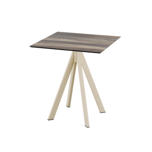4-Fußgestell aus Stahl in sandfarben. Platte aus HPL in Tropical Wood.