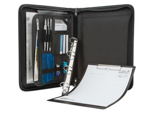 "description": "f. DIN A4, HxBxT 375x280x64mm, 4-Ring-Mechanik, herausn. Klemmbrett, div. Fächer, schwarz",