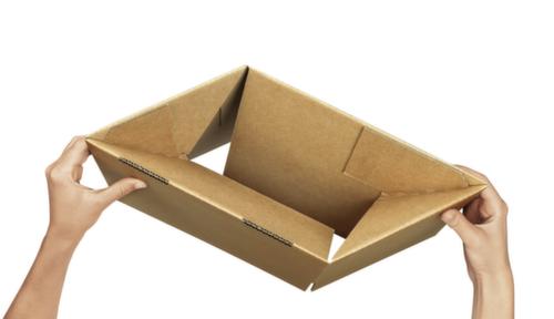 Die wichtigsten Details auf einen Blick:Für leichte bis mittelschwere Packstücke bis 10 kg. Widerstandsfähig gegen Feuchtigkeit und Temperaturschwankungen. Schnell aufgerichtet, denn durch leichten Druck auf die Seiten rastet der Automatikboden des Kartons ein. Verschließbar mit Haftklebeverschluss. Karton wiederverwendbar.