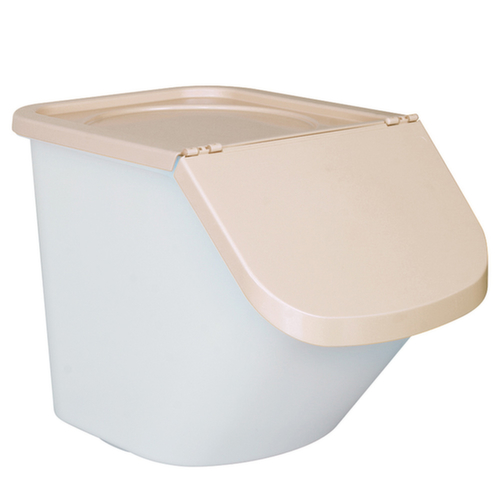 Aus bruchsicherem Polypropylen. Behälter in weiß und Deckel in beige. Wände: glatte, nahtlose Flächen für eine leichte Reinigung. Ausgestattet mit Schaufel, die gemäß HACCP-Richtlinien im Behälter aufgehangen werden kann. Geeignet für Schüttgüter aller Art. Verschließbar mit Klappdeckel. Der Deckel lässt sich auch öffnen, wenn mehrere Boxen aufeinander gestapelt sind. Der Behälterinhalt lässt sich dank der abgeschrägten Eingrifföffnung leicht entnehmen. Lebensmittelgeeignet.